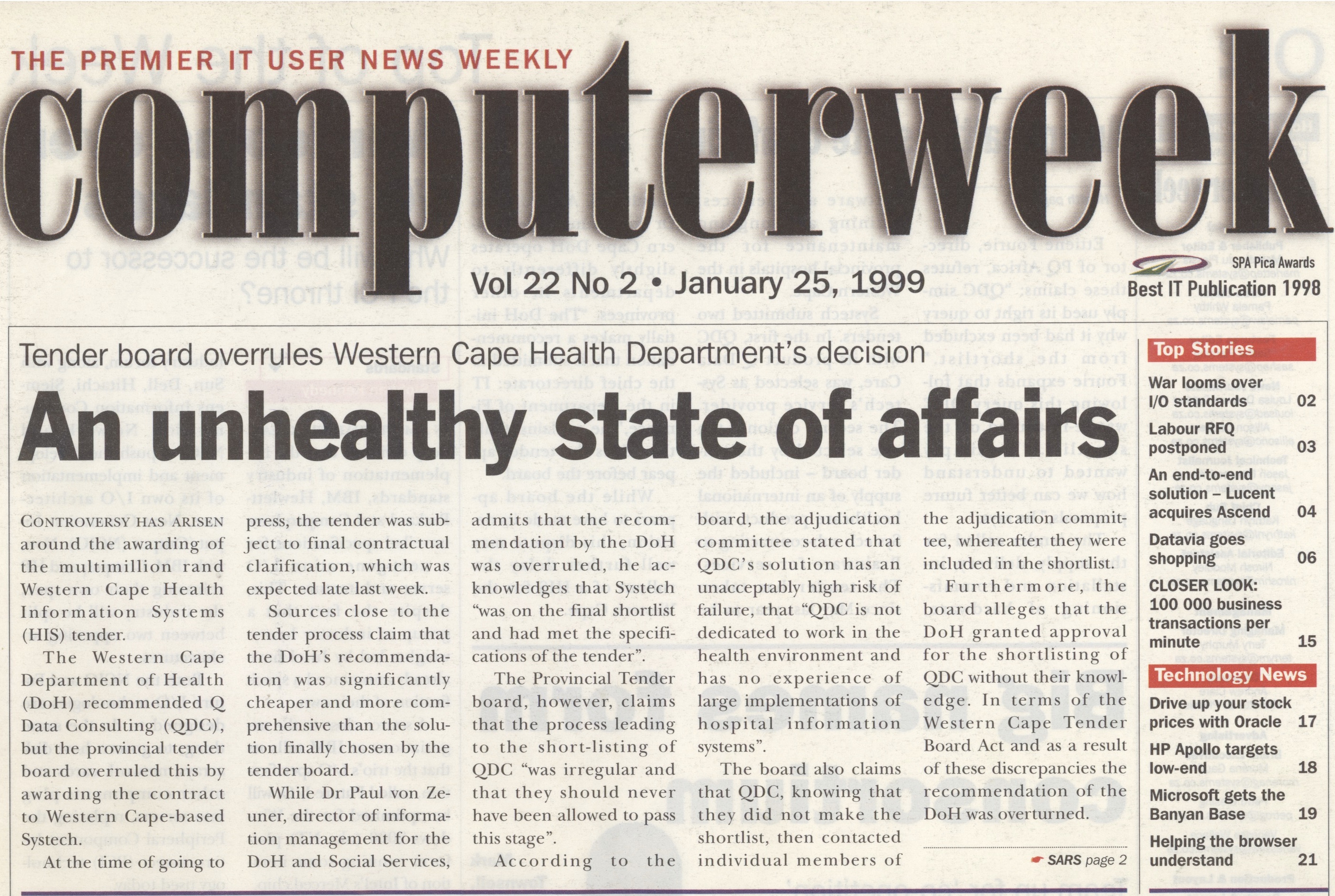 In the late 1990s I was a reporter and later news editor for the South African trade magazine Computerweek, owned by Systems Publishing. My beats were IT in government, healthcare, transport and utilities. I interviewed numerous high-profile government leaders and broke a fair number of exclusive stories. I also learned how to switch on a computer. A few cuttings below.